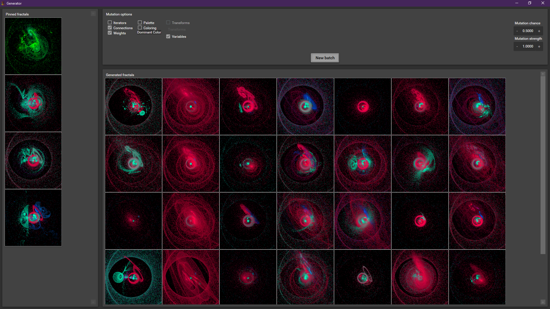 Create a New Batch of fractals and pick the ones you like the most. Your selections will be added to the sidebar and they represent the "fittest" fractals. Each new batch you generate will be based on these fittest params, so the population of fractals is becoming better and better by each generation.