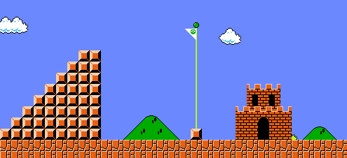 Toward the beginning of World 1-1 in Nintendo’s Super Mario Brothers, Mario must hop over two "half-pyramids" of blocks as he heads toward a flag pole. Below is a screenshot.