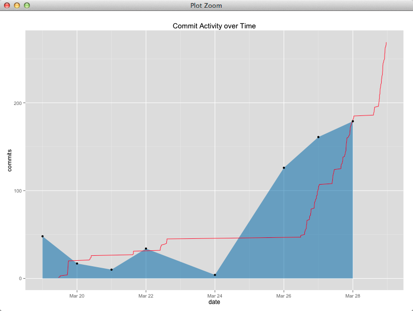 In this plot, the blue ribbon bins the total number of commits per day. The red curve shows the cumulative sum of commits over time.