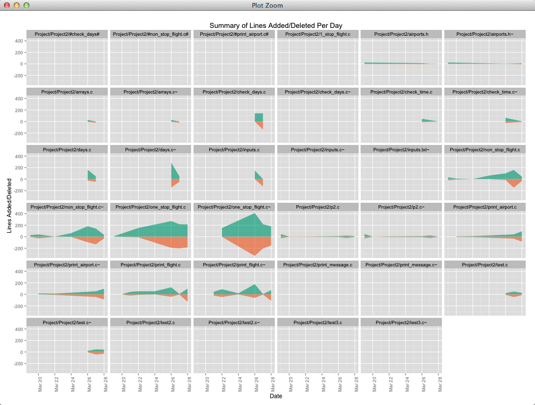 This plot shows a small multiple for each unique file in the project. The green ribbon represents total number of lines added per day. The orange ribbon is total number of deletions per day.