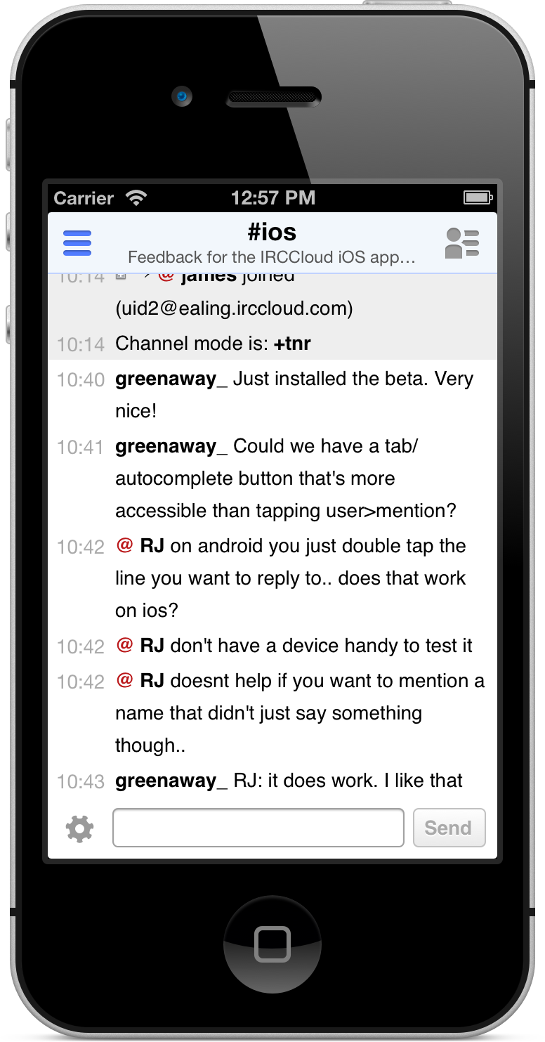 Join our #feedback channel on irc.irccloud.com for feedback and suggestions so we can improve the app. You can also email us on team@irccloud.com or find us on Twitter @irccloud.