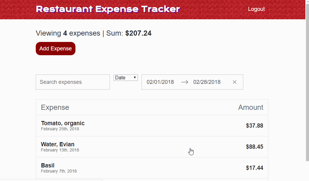 "Expense-Manager" allows an individual user or company to track personal or business expenses. Expense-Manager is built in React with SCSS styling which permits each individual element to occupy separate files making the product easily scalable and customizable by swapping components in and out as required for a wide variety of end users. The app is fully responsive for a seamless mobile user experience. This version of the Expense-Manager has been customized for use in food service and restaurant environments. As an added feature, if a restaurant manager finds themselves in the back office entering invoices when a call for a reservation comes in, they can click the "Reservation" link and be taken to our Reservationist-2 product, saving them a trip to the host desk to enter the reservation.