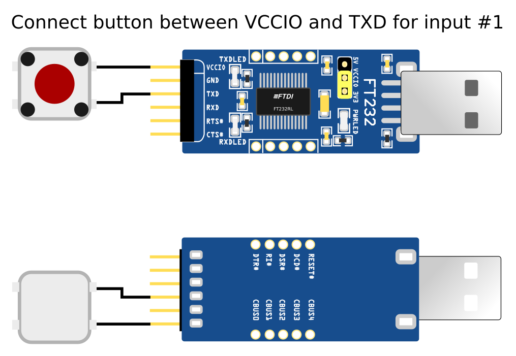 Keyboard input simulator for physical pushbuttons on (for example) Windows-based arcade game systems, utilizing the FT232 USB serial/GPIO device