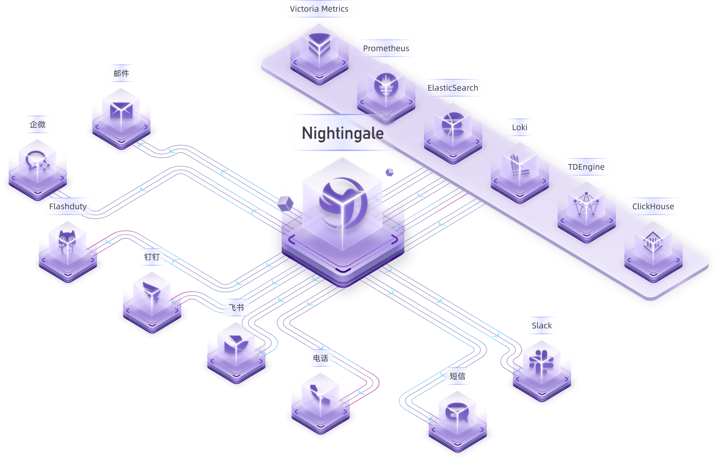 Nightingale focuses on being an alerting engine, responsible for generating alarms and flexibly distributing them based on rules. It supports 20 built-in notification medias (such as phone calls, SMS, email, DingTalk, Slack, etc.).