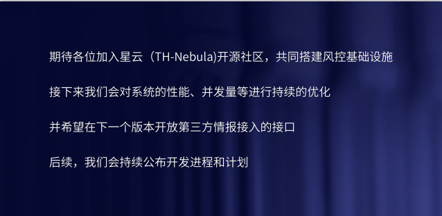 与黑灰产的多年对抗中,我们看到了黑灰产无数次的狂欢,也看到了太多企业遭受攻击后的无奈和辛酸。但是目前整个互联网行业中的风控系统基础设施普及率还不到5%。通过开源,我们希望能让更多人意识到风控的重要性,能以更低的成本,完成风控体系从无到有的搭建。黑灰产已经是一个分工明确,合作紧密的“庞然大物”,而安全行业绝大多数仍处于相对封闭,各自为战的状态。虽然协同合作已经是行业共识,但一直缺乏有效的举措。通过开源星云业务风控系统,我们希望走出这一步,集结社区力量,让更多的安全从业者可以参与进来,贡献自己的力量。