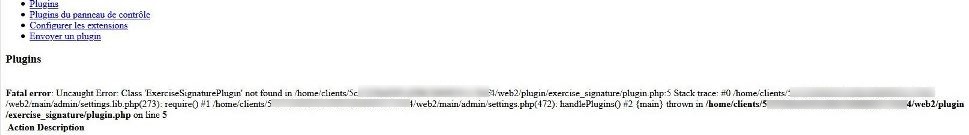 There is no more error message into this panel if i add this line into the plugin.php file : require_once DIR.'/lib/ExerciseSignature.php'; (it is the same issue with positioning, xapi....)