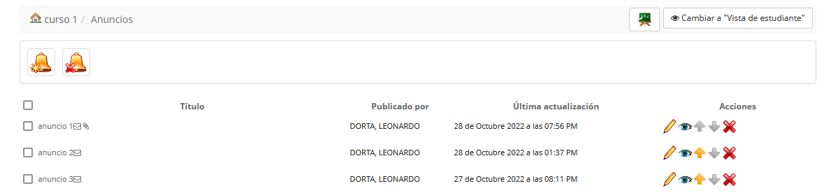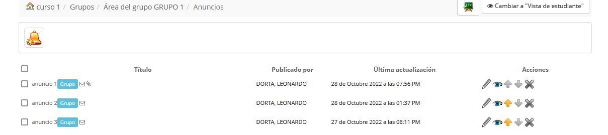Pero si entramos en el detalle de un de los anuncio que fue creado para un grupo en concreto y volvemos al listado pulsando el icono de acción de volver al listado, veremos como en el listado aparece con alguno de los anuncios con las opciones deshabilitadas.