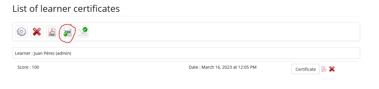 This new feature adds a button to allow download a CSV with the user data, certificate issue date, score and optional extra user fields