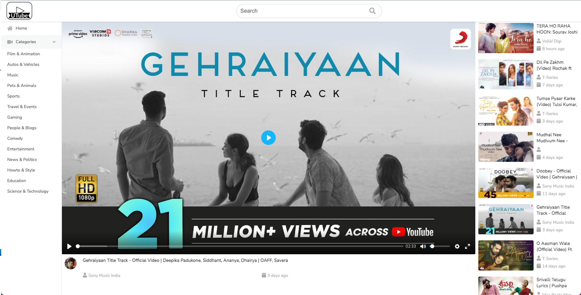 UTube (Youtube Clone) Youtube Clone Made with Vue3 Demo Link Project setup Create .env file in root folder of the application and add your youtube API KEY VUE_APP_GOOGLE_API_KEY=your_api_key_here Install dependencies yarn Compiles and hot-reloads for development yarn serve Compiles and minifies for production yarn build Lints and fixes files yarn lint Customize configuration See Configuration Reference.