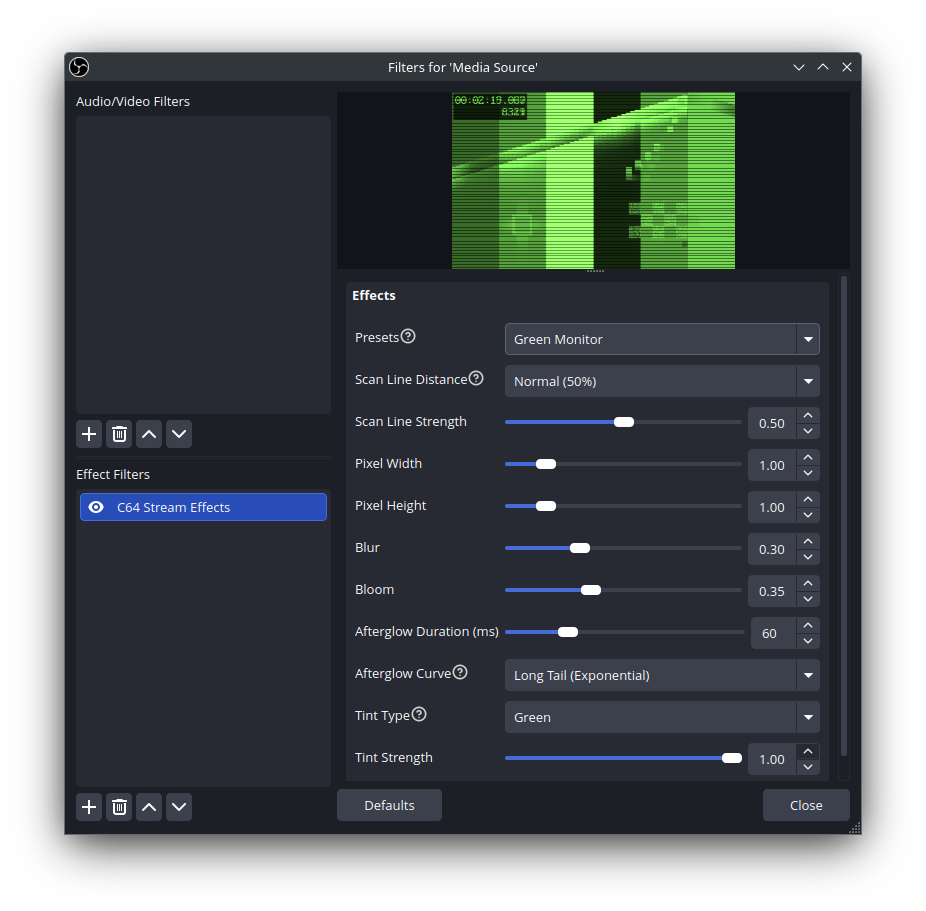 Important: If you are using the C64 Stream input source, do not add this filter. Effects would otherwise be applied twice.