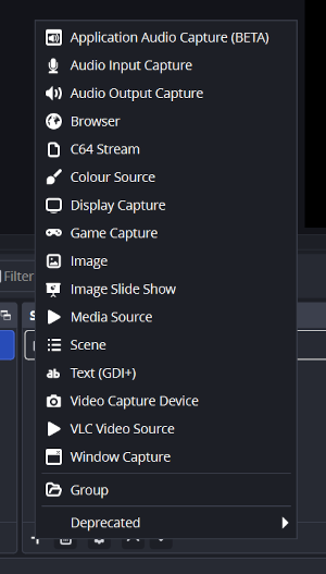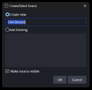 - Add Source: In OBS, click the "+" icon in the Sources tab. A window of all sources appears. Select "C64 Source":