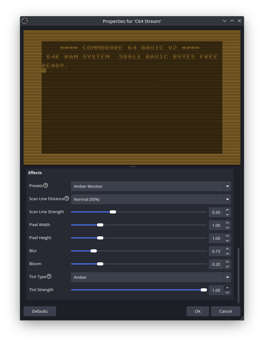 However, the same visual effects engine can also be applied to any OBS source using the C64 Stream Effects filter. This is useful if: