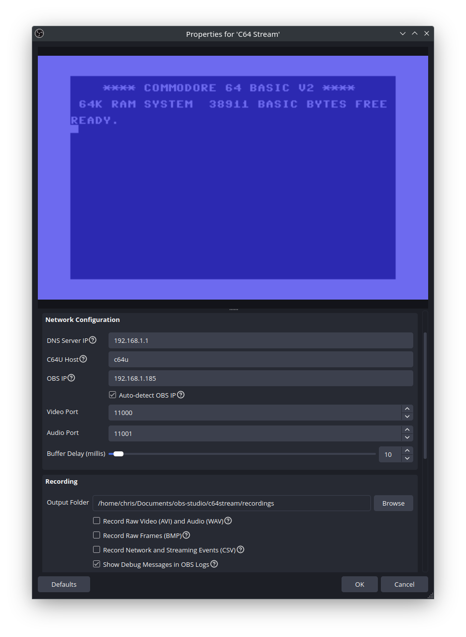 c64u) or IP address to enable automatic streaming control from OBS (recommended for convenience), or set to0.0.0.0to accept streams from any C64 Ultimate on your network (requires manual control from the device) - C64 Ultimate Password: C64 Ultimate network password for REST