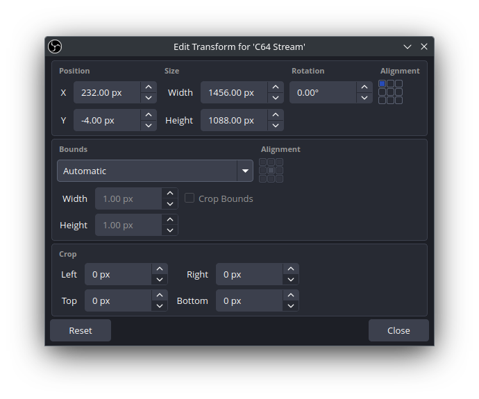 ~/Documents/obs-studio/c64stream/(e.g.,/Users/yourname/Documents/obs-studio/c64stream/) - Linux: