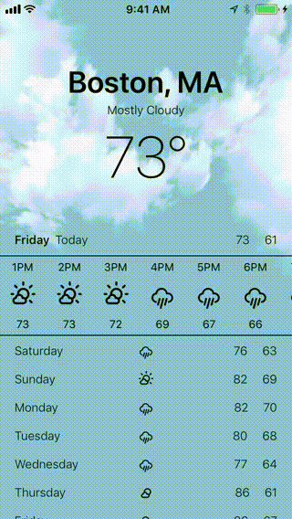 Swift app that displays the current weather conditions using the DarkSky API. The app follows an MVVM architecture using SwiftUI and Combine.