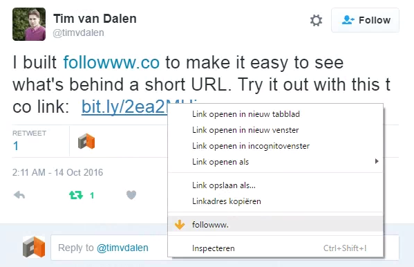 followww. Chrome extension https://chrome.google.com/webstore/detail/followww/dmpapbglnlfchgbbnalpcekkfdddagdm This extension adds a 'followww.' option to the Chrome link context menu.