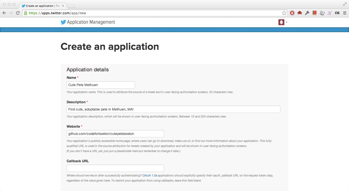 4) Fill out the form. You can put in http://www.github.com/codeforboston/CutePetsBoston as the website URL, like so: