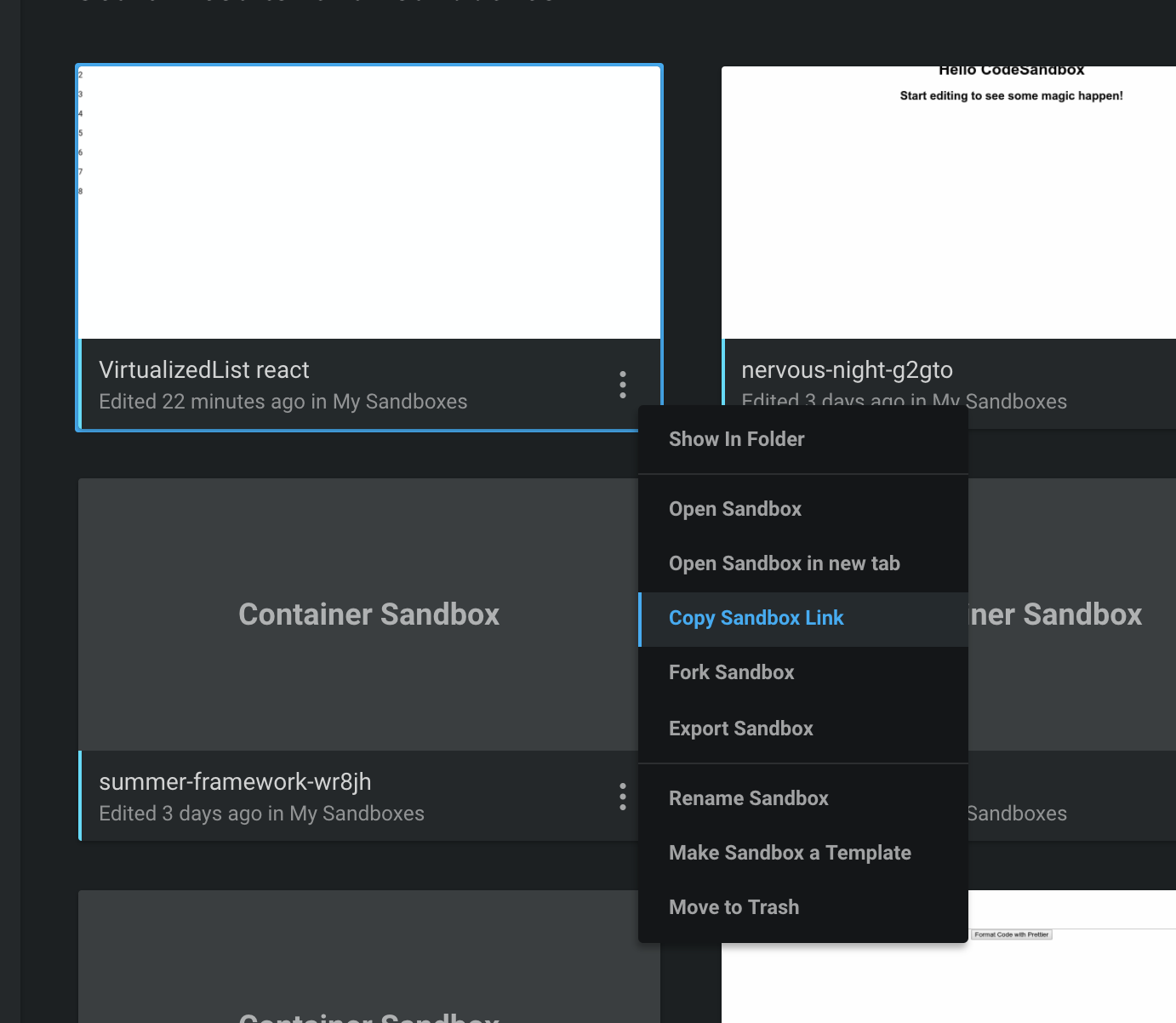 We cannot get/copy the sandbox link from the dashboard. Usecase: I wanted to share a link of old codesandbox so I searched on the dashboard and had to open the sandbox to get the link.
