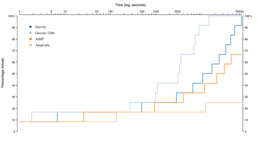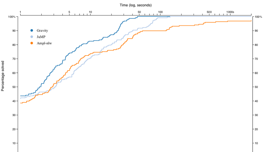 The first figure below is a performance profile illustrating percentage of instances solved as a function of time. The figure compares Gravity, JuMP and AMPL's NL interface (used by AMPL and Pyomo) on all standard instances found in the PGLIB benchmark library.