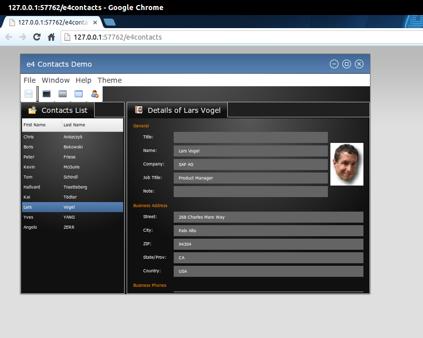 Here's the E4 Contacts demo running on RAP: