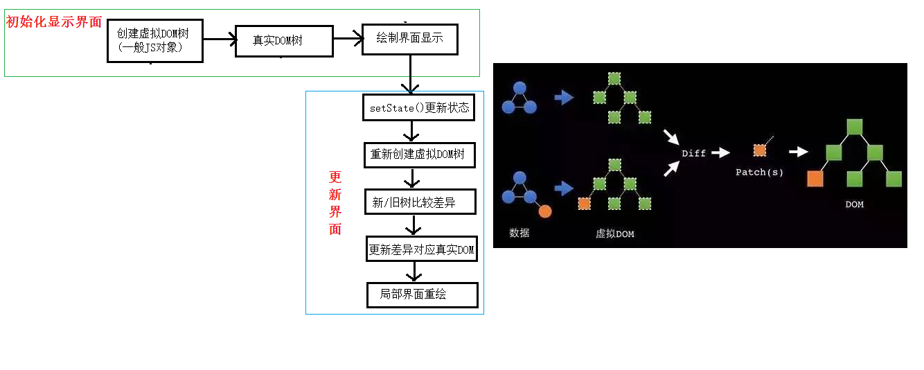 虚拟(virtual)DOM, 不总是直接操作DOM(批量更新, 减少更新的次数)