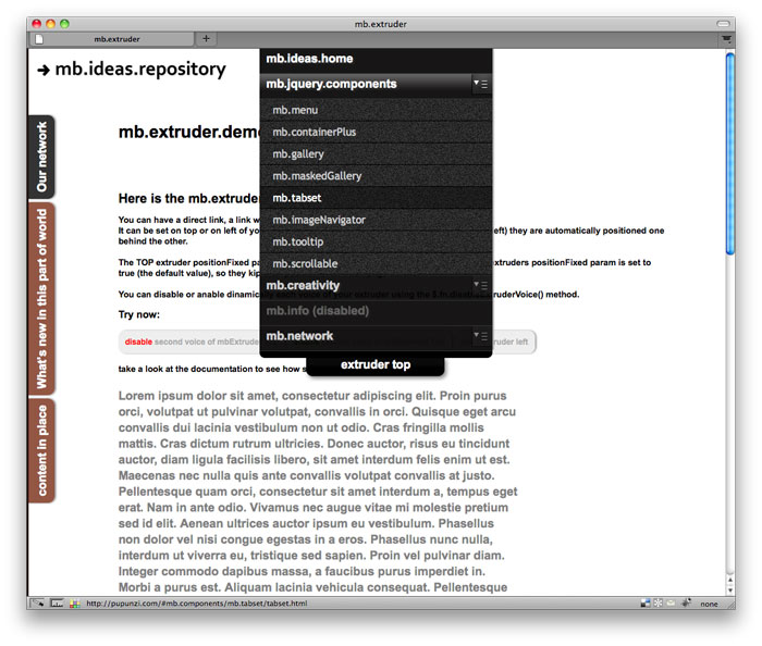 mb.extruder 1.6 An open source jQuery component to easily build a top or left sliding panel. go to the demo go to the doc go to the blog jquery.mb.components, another way of thinking the web