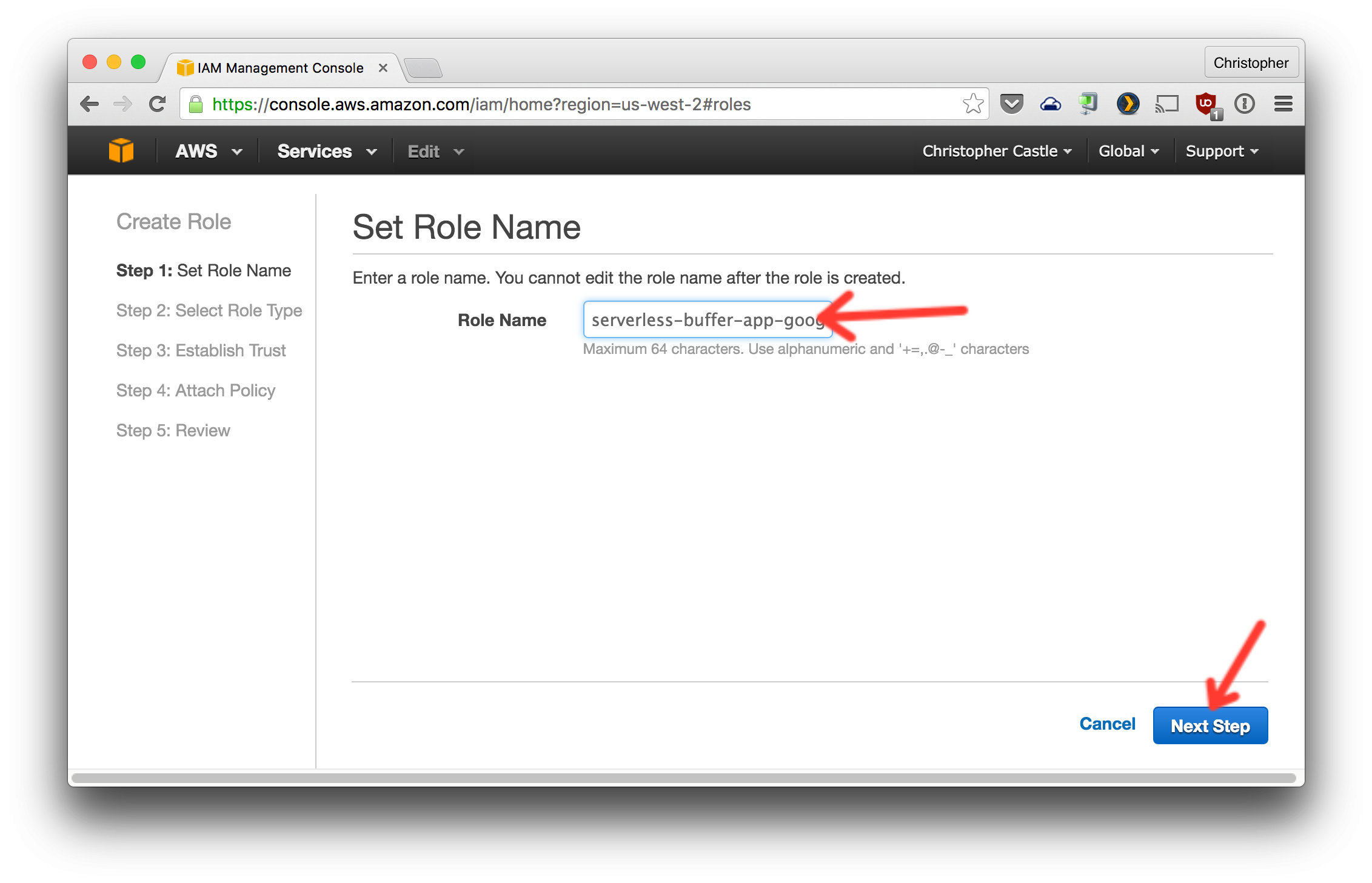 - Copy/paste the new role's ARN to the serverless-buffer-app-gui config file and finish creating the role. (TODO: update path of config file)