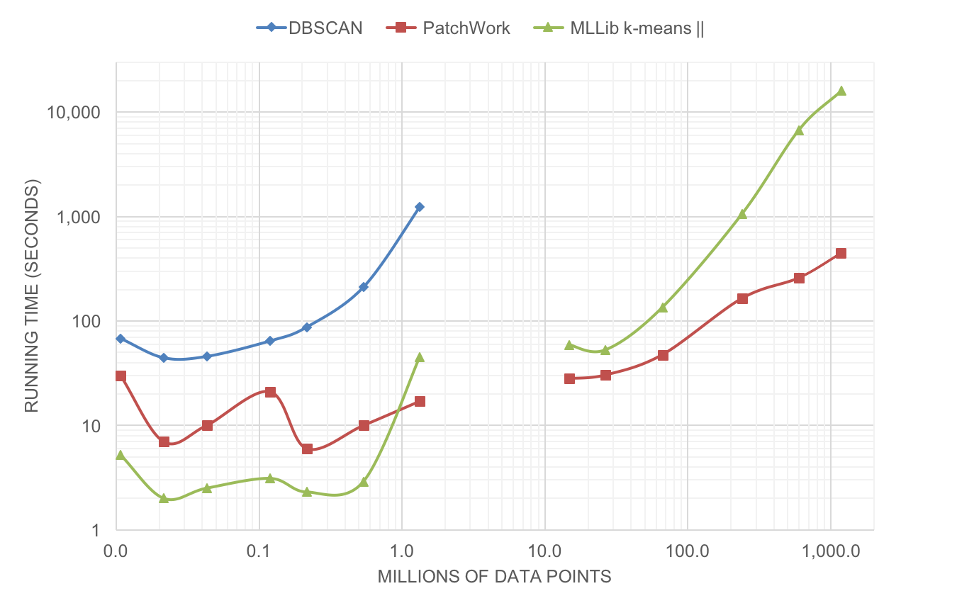 The figure below shows the running-time of the three algorithms to cluster up to 1 billion data points. Both X and Y-axis are logarithmic and represents the running-time in seconds. The quadratic complexity of DBSCAN significantly impact the running-time of the algorithm. For large datasets with over 10 millions entries, Spark-DBSCAN was unable to terminate in a timely fashion, hence is not shown. In fact, in half the time, PatchWork could cluster 1 billion points while Spark-DBSCAN could only cluster 1.2 million points, a 1000-fold improvement.