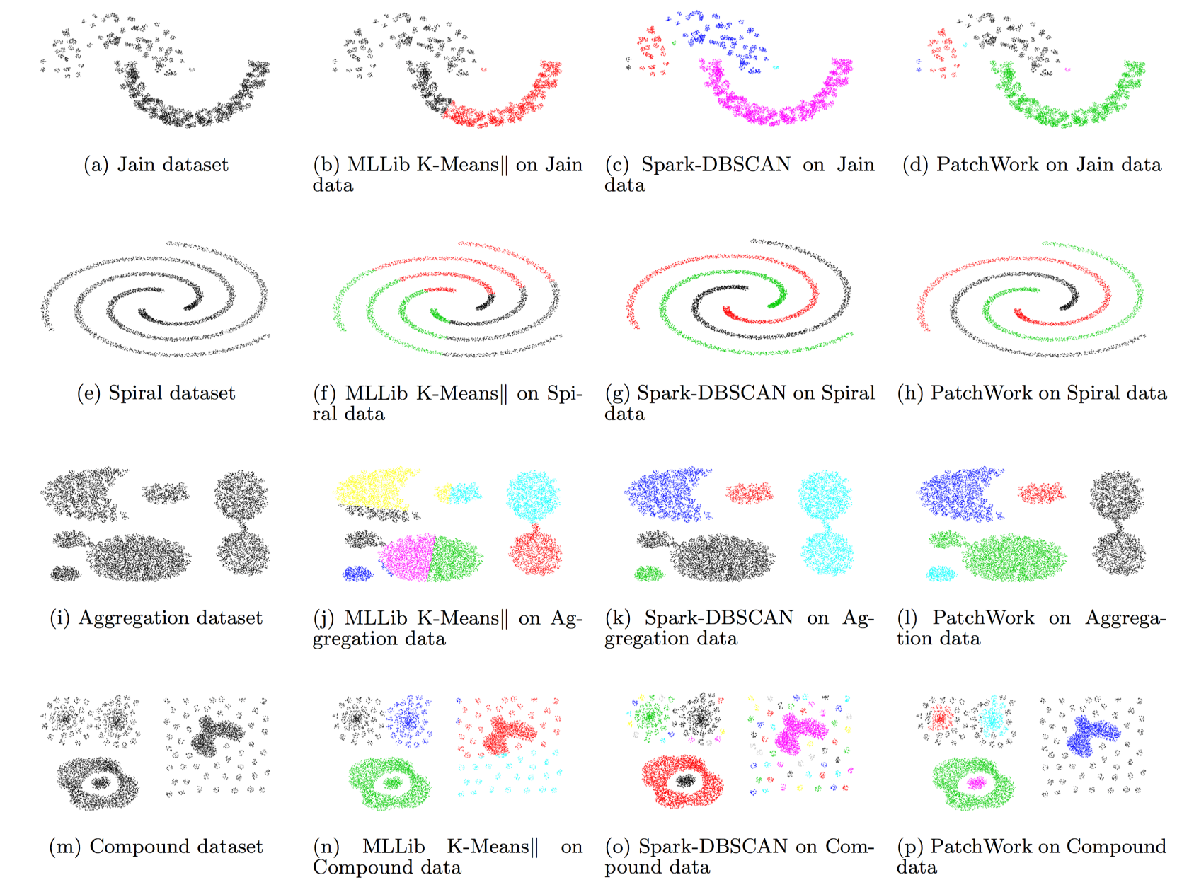 We evaluated PatchWork using four synthetic datasets commonly used to evaluate clustering algorithms. Those datasets simulate different distributions of the data: Jain, Spiral, Aggregation and Compound datasets. The size of those datasets is very limited and not suitable for big-data applications. Hence, for each of those four datasets, we generated datasets of increasing size, up to 1.2 billion entries. Those datasets have the same data distribution as the original datasets while allowing us to test the scalability of the algorithms.