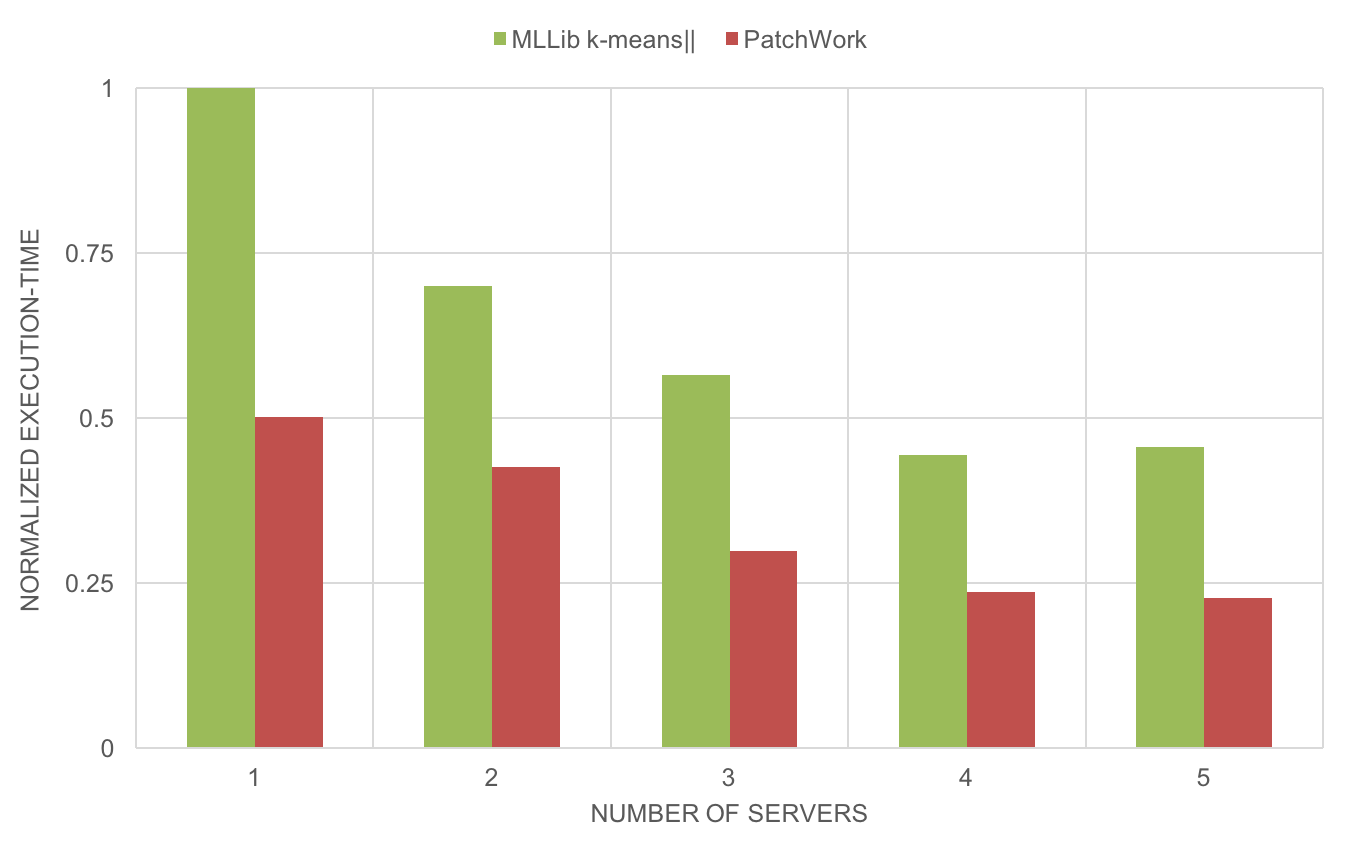 Both MLLib k-means and PatchWork have a near-linear horizontal scalability, a critical property of distributed algorithms for big-data applications: