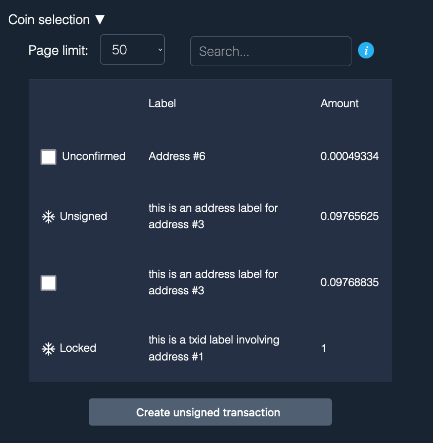 Locked UTXO or UTXO in unsigned transactions can't be chosen in the coin selection menu anymore, the checkbox is replaced by the snowflake image and the info text "Unsigned" is added to distinguish between locked and "unsigned-locked" UTXO: