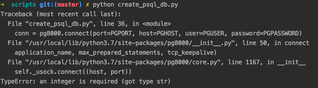 server/scripts/create_psql_db.py, an type error of integer occurs:This error is raised because of the PGPORT is a string but
