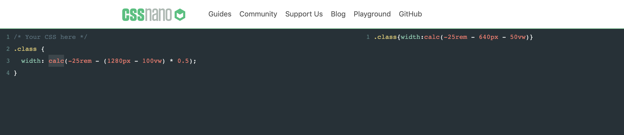### initial state ```css .class { width: calc(-25rem - (1280px - 100vw) * 0.5); } ``` ### correct minimization ```css .class{ width: calc(-25rem - 640px + 50vw); } ``` ### actual minimization ```css .class{ width: calc(-25rem - 640px - 50vw); } ```