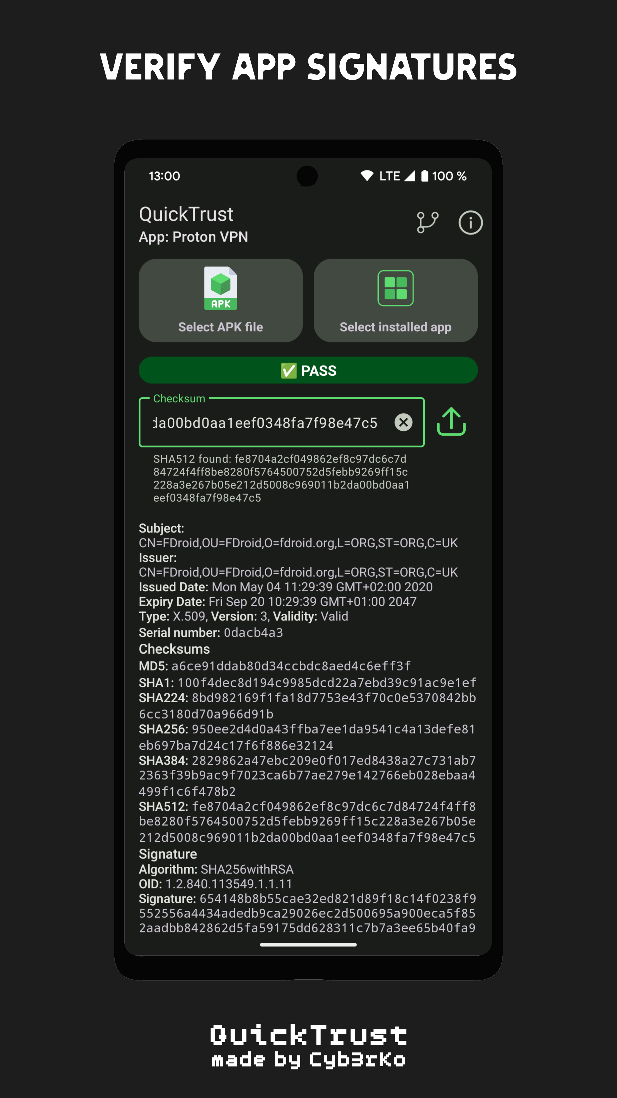 - ✔️ Verification of app signatures via hash or hashfile
