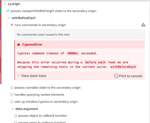 For example, e2e/multi-domain/multi_domain_spec.ts results in the 2nd test failing with no commands run: