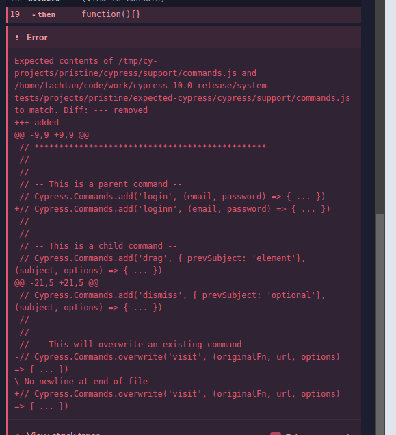 TestActionsthat is kind of like snapshots for the scaffolded files. If a project hasn't got any expected files (in thecypress-expecteddirectory) we just copy the scaffolded ones there, like a snapshot, for next time the test runs.If the files do exist, we assert the scaffolded files are the same as the expected ones.