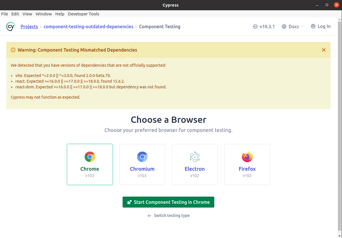 component-testing-outdated-dependencies, you could test with that, if you want. Run yarn install inside it, fire up Cypress and choose that project. You should see the appropriate warnings.How has the user experience changed?