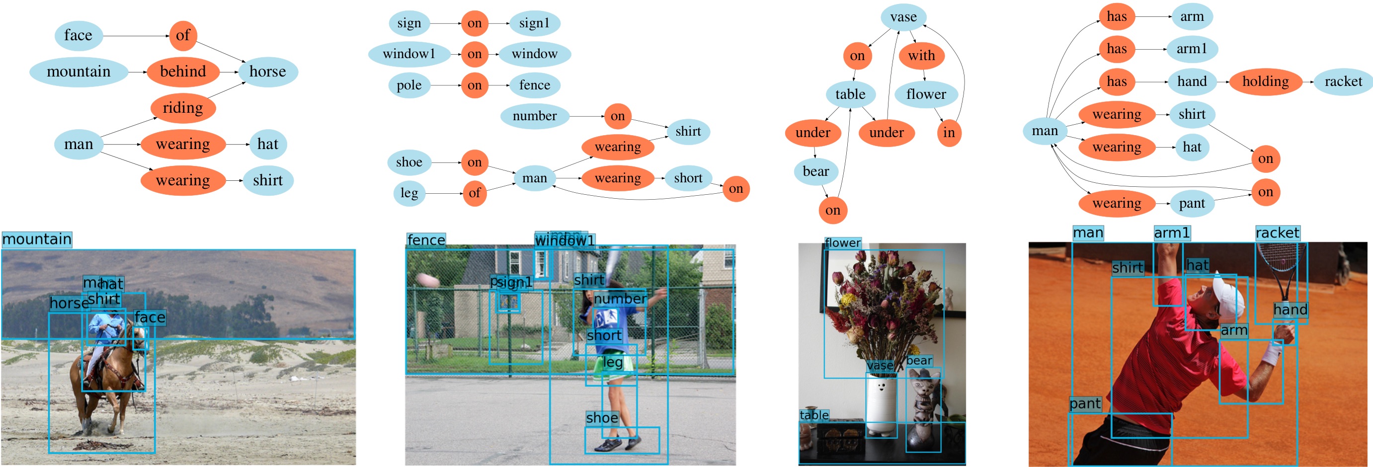 This repository contains an implementation of the models introduced in the paper Scene Graph Generation by Iterative Message Passing by Xu et al. The model taks an image and a graph proposal as input and predicts the object and relationship categories in the graph. The network is implemented using TensorFlow and the rest of the framework is in Python. Because the model is built directly on top of Faster-RCNN by Ren et al, a substantial amount of data processing code is adapted from the py-faster-rcnn repository.