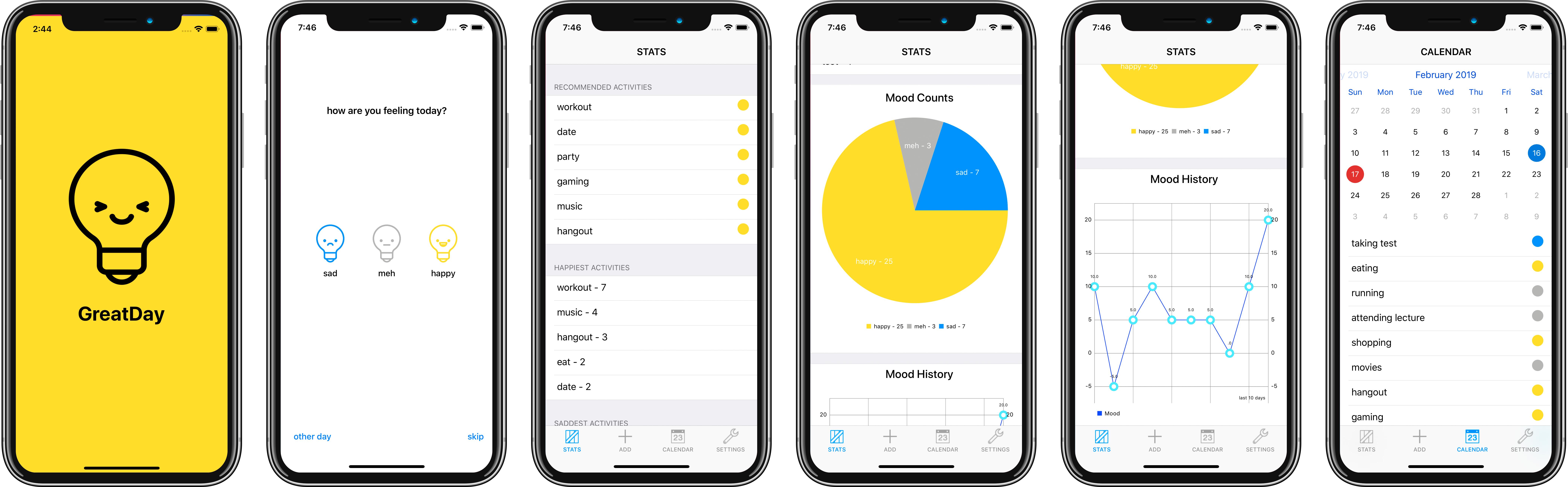 The GreatDay project is an iOS application that allows users to set a mood (happy, meh, sad) for each day and add individual activities (which are also associated with moods) for that day. Using that information, the user can view their statistics such as correlations between specific activities and moods. Furthermore, the application also recommends specific activities that may make the user happier based on the current time that they are on the app. GreatDay also provides visualizations such as a pie chart and bar graph showing the changes in moods and mood counts. The mission of GreatDay is to help improve mental wellness and help people turn their days around one by one.