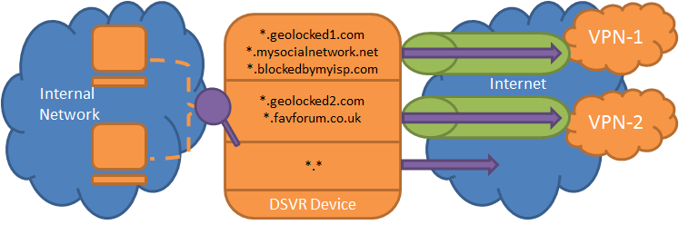 Per-site VPN routing down specific VPN connections whilst all other traffic goes down the native internet connection, for example: