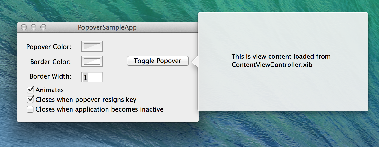 class for displaying popover windows. That said, developers who want to support older versions of OS X (like me) are unable to use that API without breaking backward compatibility. So I developed this class that will allow developers to easily add popovers into their applications and also have it be compatible with older versions of OS X. I've included a sample app to demonstrate how to use INPopoverController: