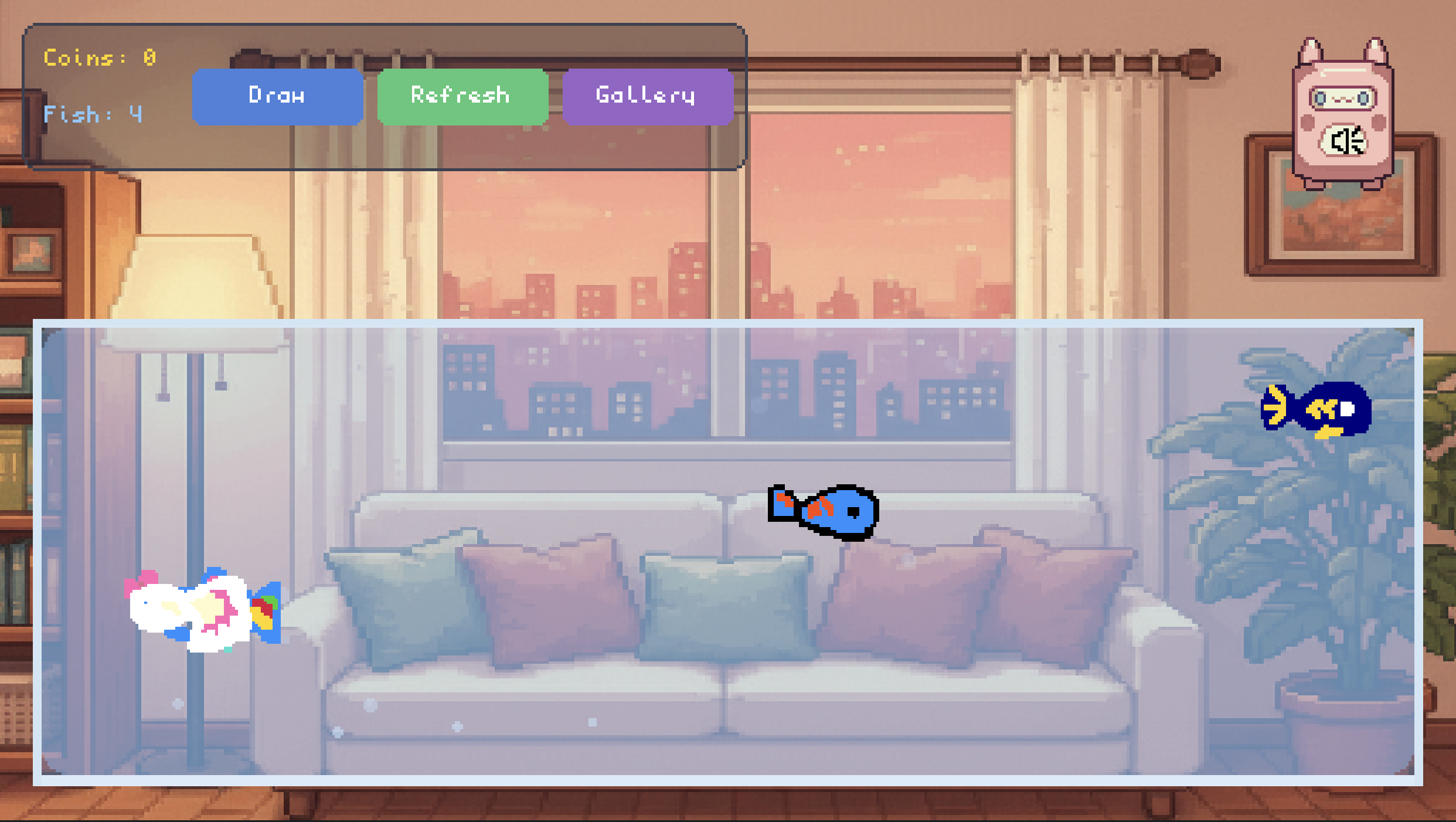 Interactive Digital Aquarium - Create, customize, and interact with your own underwater world! A relaxing, interactive aquarium game where you can design your own fish, watch them swim, and create a beautiful underwater ecosystem. Features: