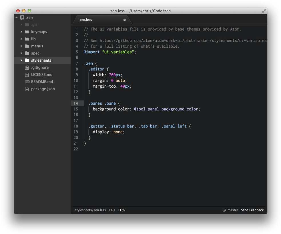 Note that settings are not available until the package has been activated, due to a shortcoming in core. Also, if you change themes, you might need to reload Atom for the colors to be applied correctly to all packages including Zen.