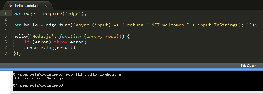 var helloWorld = edge.func('async (input) => { return ".NET Welcomes " + input.ToString(); }');