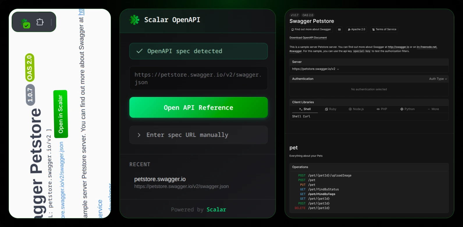 swagger.jsonlinks on any webpage and adds an "Open in Scalar" button next to them - Popup Status: Shows whether the current page has an OpenAPI spec available