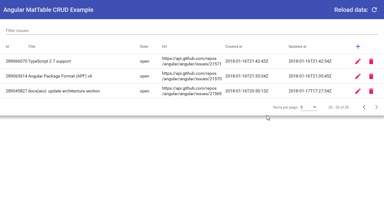 Project showcasing my CRUD (Create, Read, Update, Delete) implementation on Angular's Mat-Table. Most importantly frontend updates accordingly with operations. This is important if you're using data from backend (some DB like MySQL) but I guess It can be used for local generated data as well.