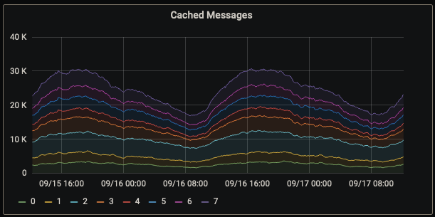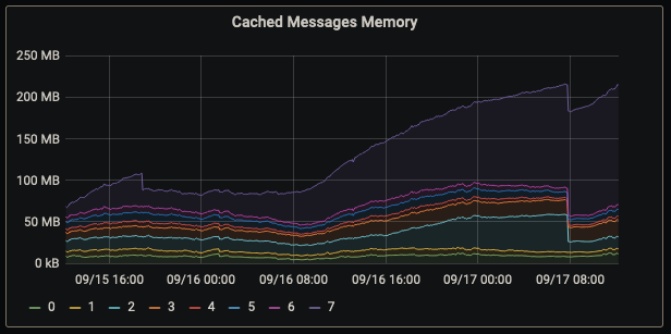 Alone, these two graphs don't say much, there are probably just more messages in that shard for one reason or another. Alas, there are not. Grafana also has a graph set up for the total number of messages in cache, using similar logic to Cached Messages Memory but without using object-sizeof, and we can see that there are a similar number of messages in the problematic shard to the other shards.