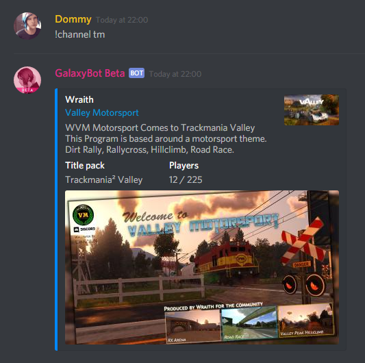 Text channel, where GalaxyBot will post and update statuses of selected ManiaPlanet servers, added using the addserver command. Up to 10 latest messages sent in the channel will show a status below them. |