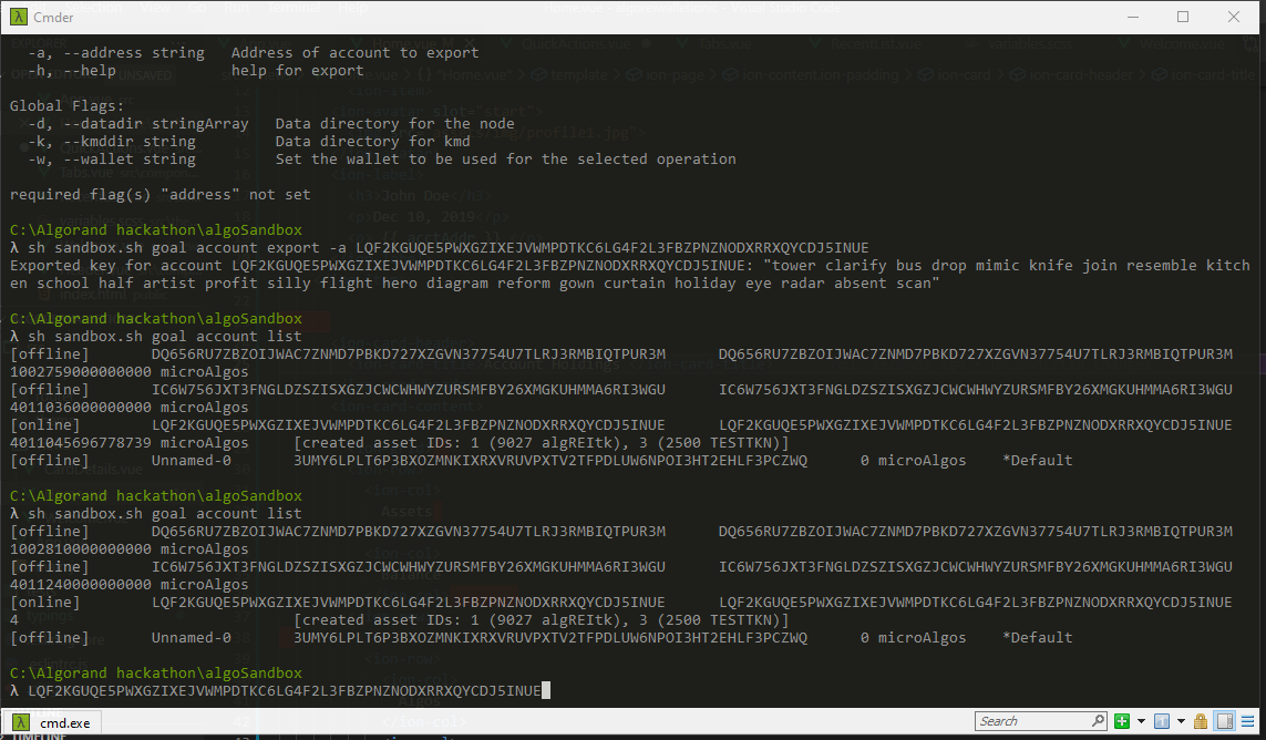 Nuestros dos front ends (dash board en Vue y la wallet basica en ionic) pueden ser activadas localmente y como demostracion estamos usando informacion ya hecha de antemano usando un Node server con express que lo usamos como un proxy para communicarnos con el Algorand JavaScript SDK