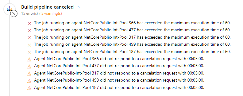 @MattGal Yes, you are right that these jobs are got cancelled due to timeout. But doesn't the fact that all the Linux jobs that are running on NetCorePublic-Int-Pool (BuildPool.Ubuntu.1604.Amd64.Open) simultaneosly hung (but none of the Windows/OSX jobs) suggests that there is/was some kind of communication problem with that pool ? |